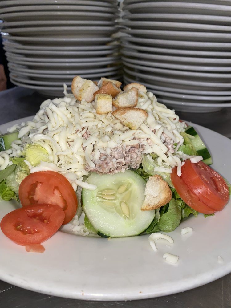 Mix of lettuce, cucumbers, tomatoes, onions, croutons with ham, salami, provolone & mozzarella.