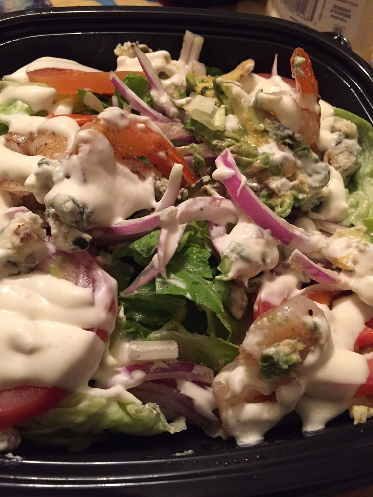 Grilled shrimp, fresh iceberg and romaine lettuce tomatoes, onion, avocado, and blue cheese crumbles.